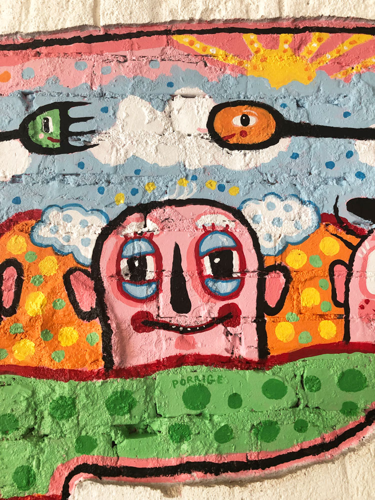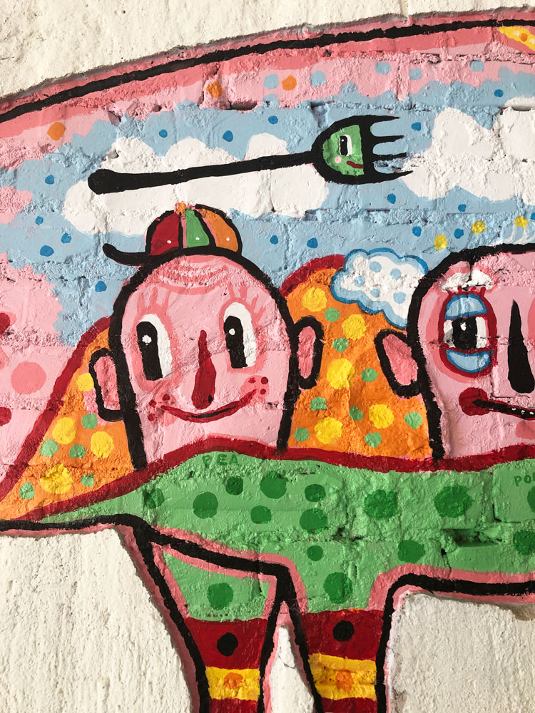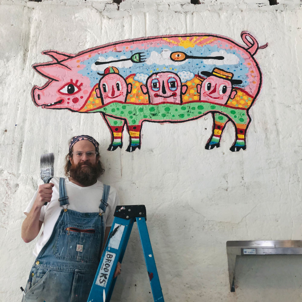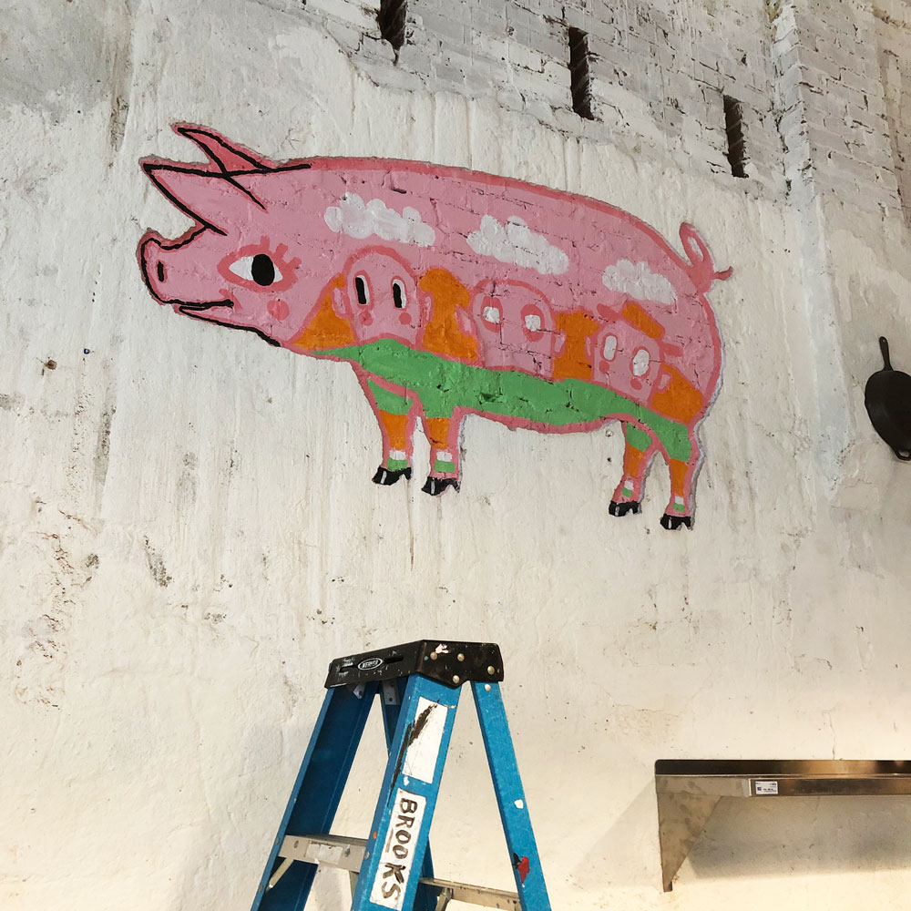 I painted a pig for my friends new shop in atlanta. On the pig real small i wrote PEA PORRIGE POT. The store will be called PURE QUILL SUPERETTE. There was an indentation in the wall in the shape of the pig. So I was asked to make it into something good. I really like to paint. A lumpy brick wall is a good challenge. Out the window I could see a Civil War battlefield. Inside the store I could see a fancy funny pig. I think the fella in the middle with the white poofy hair is named Pappy Smeet. I am always very thankful for the opportunity to paint for others.