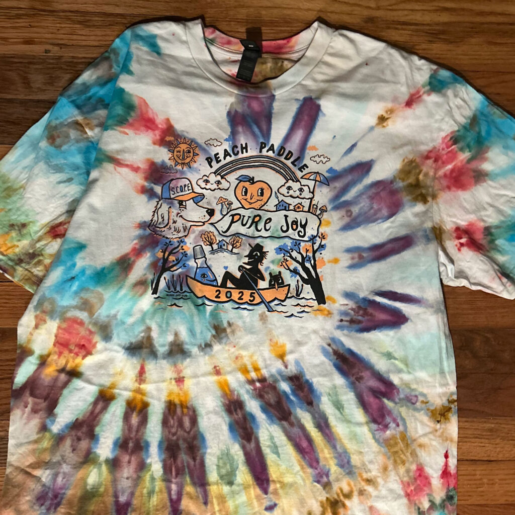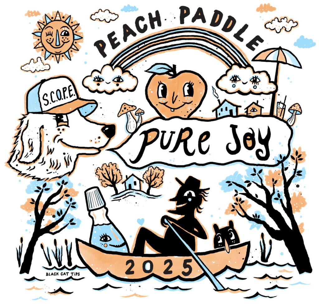 This summer I helped a friend design some shirts for his yearly event called the Peach Paddle. They go and ride canoes on the Flint River in middle-south-westish Georgia and eat peaches and cook a lot of food and have good music. He told me it was PURE JOY. I used that phrase as my inspiration. He then asked me to add some S.C.O.P.E (Sippin and Chillin On Paddling Expeditions) and some drinks and sunshines and of course peaches. I wonder if they saw any alligators?