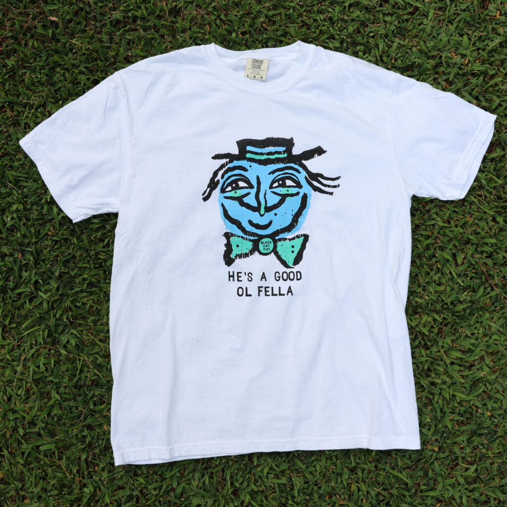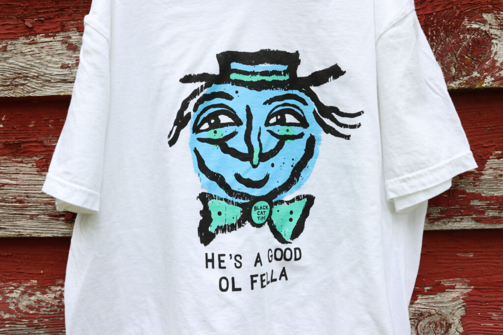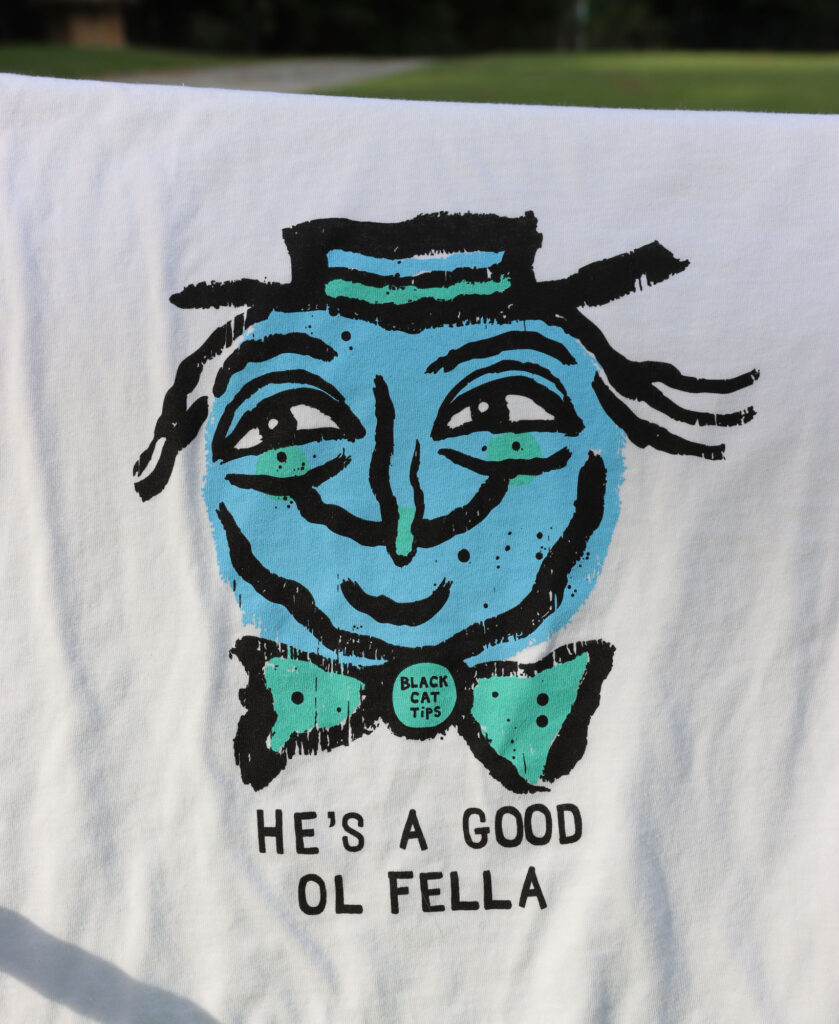 This second shirt I made was a project for myself. For a long time I have wanted to use this painting on my barn as something more… so I decided a shirt would be good. I made a shirt and a matching sticker too. I had painted the blue good ol fella on my barn years ago. Every time I see him I feel glad. I had my friends at Danger Press in Atlanta print them for me and I really like these too. I like to feel glad.
