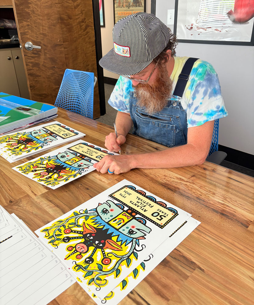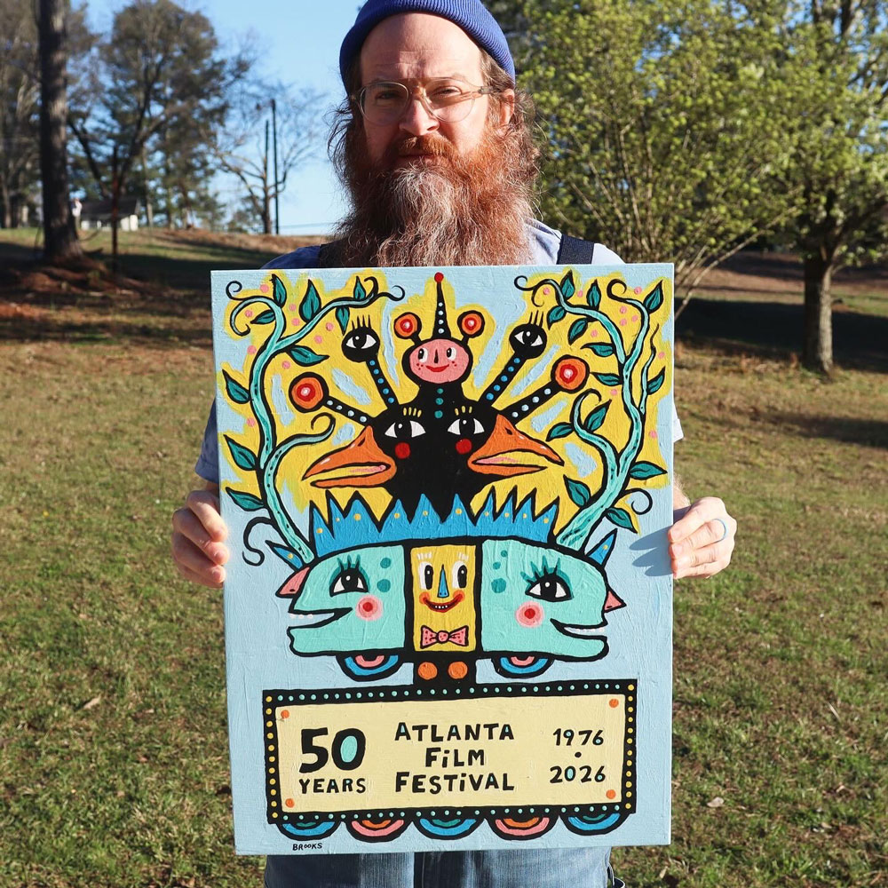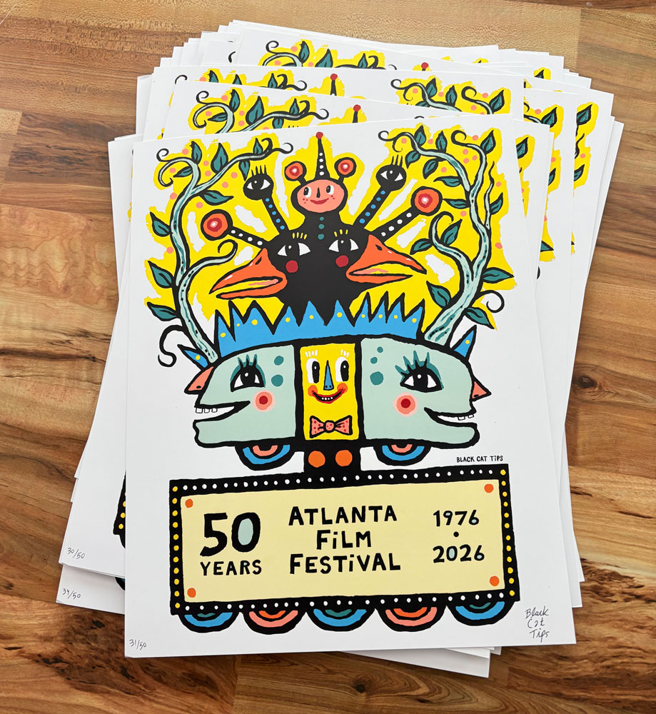 I created a poster for the 50th Anniversary of the Atlanta Film Festival. I was asked if I was interested in making art for the festival and I thought it would be a good “Atlanta” thing to do. I came up with an idea that was all BlackCatTips but also nodded to Atlanta’s Plaza Theater, a movie marquee and a film roll feel. The rest of the art is full of fun and happy faces. The little yellow face in the middle made me laugh as I felt it looked a bit like a spongey bob sort of character. The original art is 18″x24″ on wood panel. It was a bit difficult getting the lettering to layout correctly but for folk art its pretty good. :)