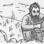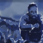 I first drew out the scene in Sharpie and ball point pen. I had a nice white cardboard label from a package of envelopes so I drew on the back of that. I only use the best equipment in my creation process! Then I scanned it and used Adobe Illustrator to trace my lines. Next I began to make shapes for the background and main character. I then brought it all into Photoshop.