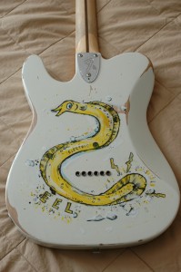 Today I got an email from a man in northern Alabama. Several years ago I painted a guitar for a highschool friend. He asked me to paint something on it so I created an Electric Eel for an electric guitar. I think I remember him auctioning it off for a charity. I gave the eel painted instrument to him and haven’t seen it again, until today!