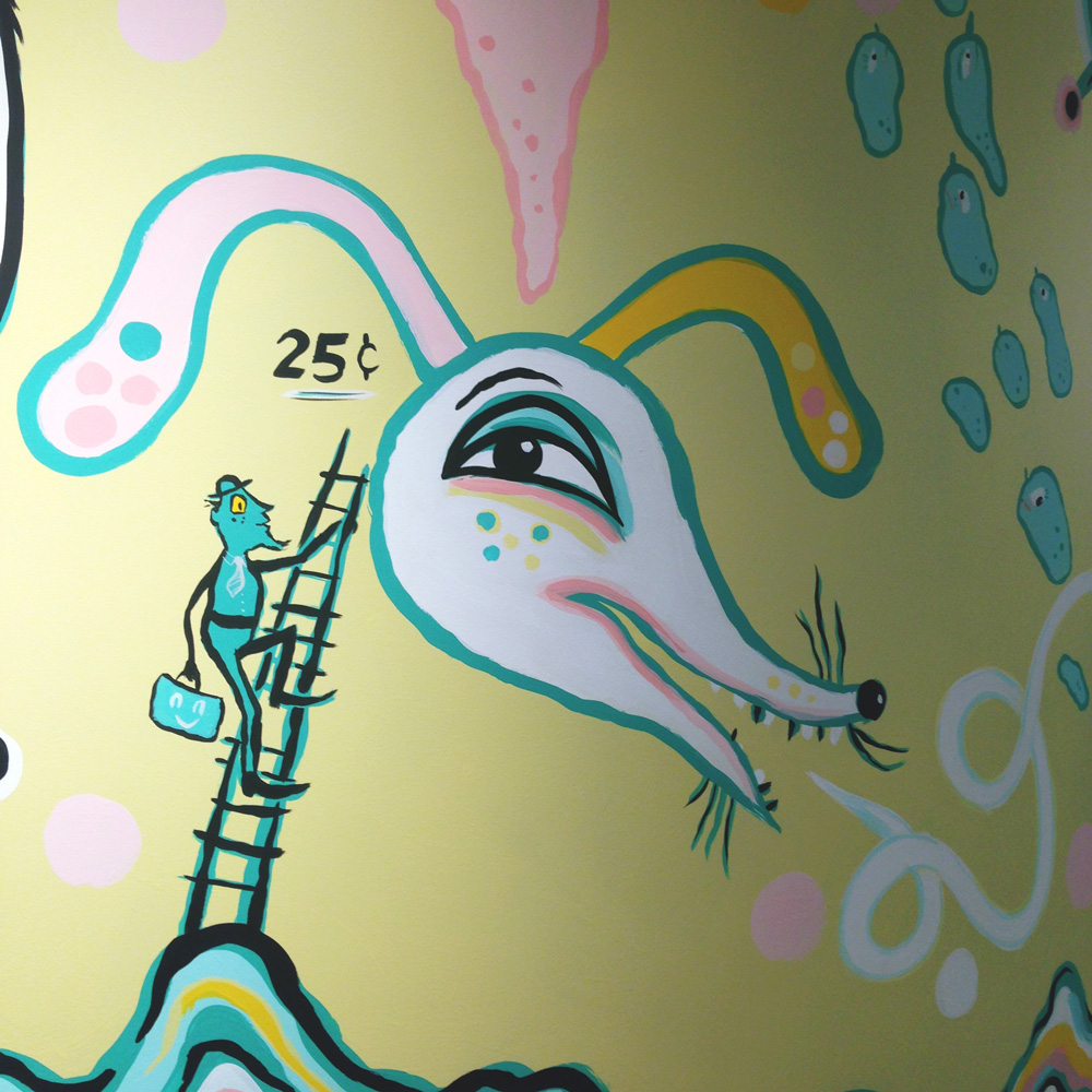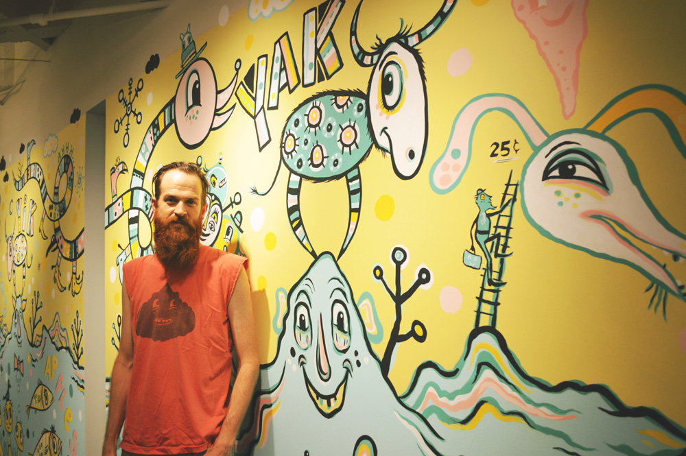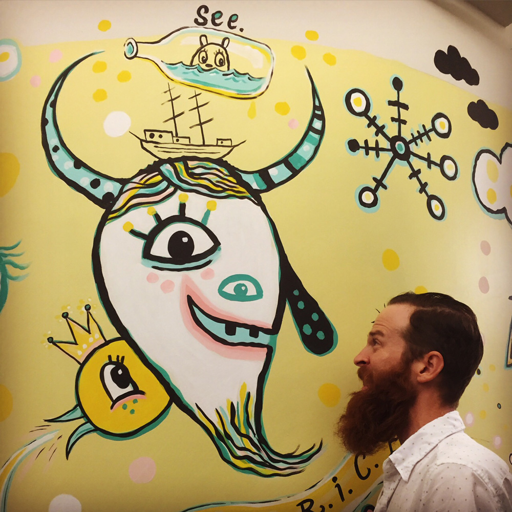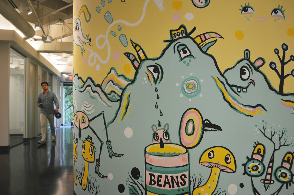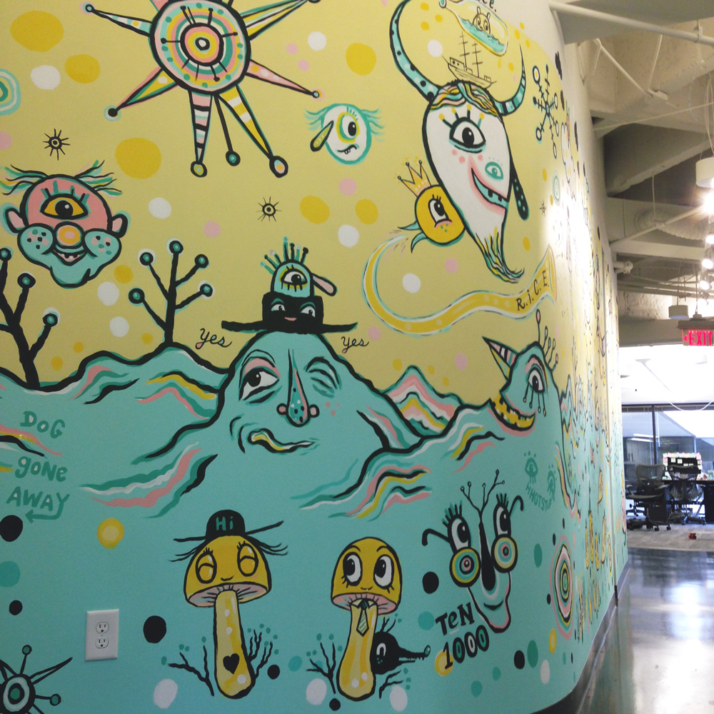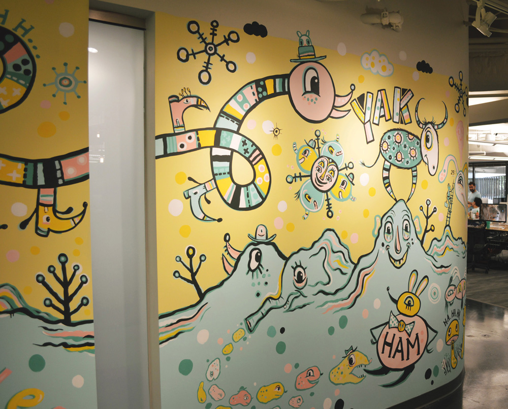 I just wrapped up a mural for the Yik Yak Headquarters in Buckhead, Atlanta, Georgia. I spent a couple weeks driving everyday with the business folks to a big building in the city, riding up the elevators and taking my brushes with me to a fancy new office. I made some friends up there at Yik Yak. I am glad they contacted me and said, “Come on over here Boy and bring your paints!“